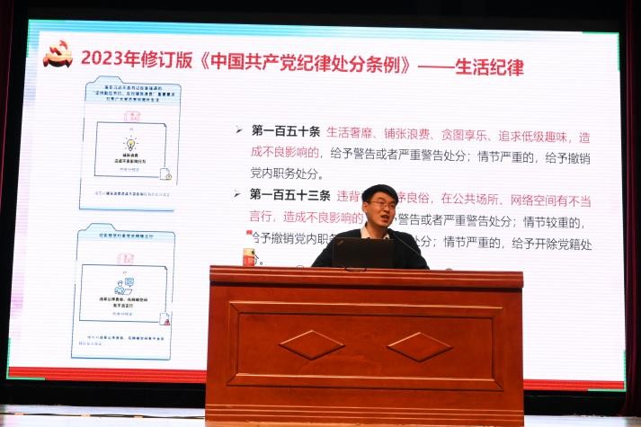 当日下午,仪器光电学院党委副书记冀赵杰老师为全体党员讲授《学党规、守党纪,做合格共产党员》的专题讲座。冀老师从党史入手,通过讲解党的建设各个历史时期对于党纪的要求,深入阐述党规党纪的重要性,并通过讲解《中国共产党纪律处分条例》,并结合与学生息息相关的生活纪律、工作纪律等内容,强调每一位党员要时刻牢记党规党纪,做到守纪律、讲规矩,切实提升党员的党性修养和政治觉悟,切实起到党员的模范带头作用。