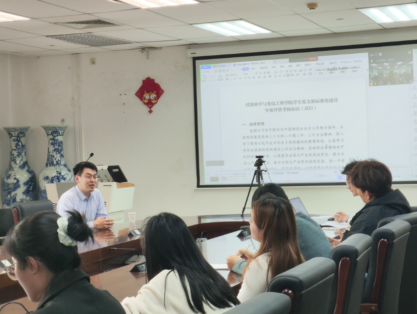 随后,召开了学生党支部书记联席会,学院党委副书记冀赵杰老师向大家讲解了仪器光电学院学生党支部标准化建设年度评价考核办法,结合学院2025年度工作重点,进一步明确了学生党支部标准化建设的各项工作要求。他强调,各支部书记要充分发挥带头作用,严格落实党员教育管理和积极分子培养责任,积极创建“一支部一品牌”,推动党组织与科技创新、学业发展相融合。