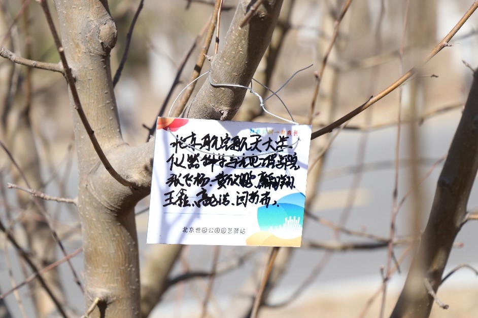 植树现场,同志们身穿红色马甲,手握铁锹,精神饱满、干劲十足。通过合理成组,分工协作,植树各个环节衔接有序,配合默契。两个小时的忙碌后一颗颗小树苗便迎风而立,为世园公园增添了一抹“北航风”新绿。在植树活动完成后,各组开展了挂牌仪式,在铭牌上写下了对北航和祖国的美好祝愿。在暖阳与春风的照拂下,树苗迎风飞扬,肆意生长。植树的意义不仅在于活动本身,更是在同志们心中播下春天的希望,热爱自然、保护自然,为祖国的可持续发展贡献自己的力量。抓住植树节的契机,随后各党团支部以劳育和爱国主义教育为主题,举行了丰富多彩的主题党日、团日活动。