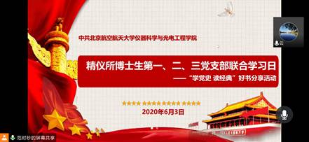 2020年6月3日下午,仪器科学与光电工程学院精仪所博士生第一、二、三党支部线上开展“学党史读经典”好书分享活动,活动由精仪所博士生第三党支部书记范时秒同志主持,全体党员同志及部分入党积极分子参加了此次活动。