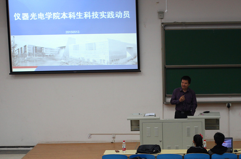 大会初始,钱政教授总结了学院第二十五届冯如杯的参赛情况并做科技实践动员,钱教授提到我系在第25届冯如杯中的最终排名是全校第八名,成绩虽然不能说明一切问题,但是也在一定程度上反映了学院本科生科技创新氛围不够浓厚。本次动员大会之所以早早召开,目的就是培养同学们的科技创新意识,鼓励同学们积极思考,自由组队,踊跃参加冯如杯竞赛。今后学院将开展以仪器光电杯为基础的科技练兵,以冯如杯为载体的实战演练相结合的选拔培养模式,努力让学院本科生的科技创新水平更上一层楼。